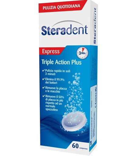 Steradent Triple action plus Compresse igienizzanti per dentiere sia totali che parziali.Pulizia rapida in soli 3 minuti grazie alle micro-bolle di ossigeno attivo che eliminano il 99.9% dei batteri. Rimuove la placca e le macchie. Rimuove il 50 % di placca in più rispetto ad un normale spazzolin ...