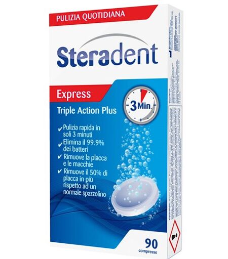 Steradent Triple action plus Compresse igienizzanti per dentiere sia totali che parziali. Pulizia rapida in soli 3 minuti grazie alle micro - bolle di ossigeno attivo che eliminano il 99.9% dei batteri. Rimuove la placca e le macchie. Rimuove il 50 % di placca in più rispetto ad un normale spazzoli… ...