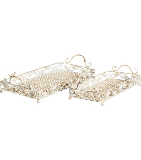 Set 2 vassoi in ferro lavorati a mano con due manici in metallo L57+43XPR16+19XH12+10 cm. La struttura intrecciata, i dettagli ornamentali e la finitura bianca antichizzata donano un fascino romantico ideale per ambienti vintage, country o provenzali. Usali per servire con stile, come base per decorazioni floreali o per creare splendidi allestimenti decorativi. Che tu voglia dare un tocco retrò alla tua cucina, sala da pranzo o utilizzare i vassoi come elementi decorativi in eventi, matrimoni o shooting fotografici, questo set sarà il protagonista perfetto. Tutte le misure sono riferite all'ingombro massimo dell'articolo. Questo set di 2 vassoio rettangolare in ferro offre un autentico stile shabby chic con una finitura bianca anticata. Ogni vassoio è un pezzo unico che aggiunge un tocco di charme vintage al tuo arredamento. Il vassoio caffe è lavorato a mano con cura e attenzione ai dettagli, il che si traduce in una qualità e un'originalità senza pari. Ogni vassoio è un'opera d'arte ...