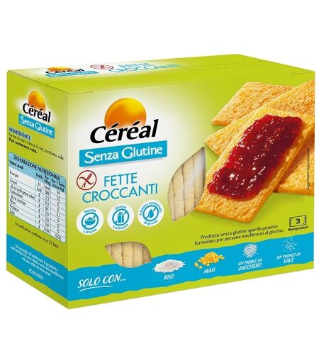 Céréal FETTE CROCCANTI Descrizione Fete con farine di mais e riso. Prodotto senza glutine specificamente formulato per persone intolleranti al glutine. Ingredienti Farina di mais, farina di riso, zucchero, sale. Può contenere soia. Senza glutine, lattosio e lievito. Caratteristiche nutrizionali Valori medi per 100 g per fetta (circa 6 g) Energia 1.646 kJ/388 kcal 99 kJ/23 kcal Grassi di cui acidi grassi saturi 2,3 g 0,3 g 0 g 0 g Carboidrati di cui zuccheri 85 g 2,9 g 5,1 g 0 g Fibre 2 g 0 g Proteine 5,9 g 0 g Sale 0,96 g 0,06 g Modalità d'uso Si consiglia di utilizzare il prodotto nell'ambito di una dieta varia ed equilibrata ed uno stile di vita sano. Conservazione Conservare in luogo fresco e asciutto. Formato La confezione contiene circa 21 fette. 3 monoporzioni (125 g). Cod. 221504 ...