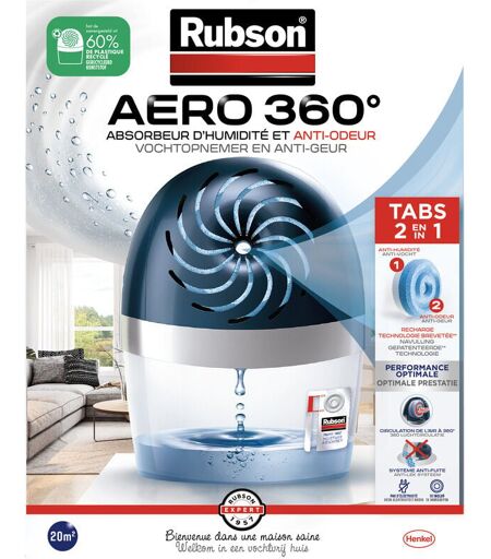 Assorbitore di umidità RUBSON AERO 360 20m² + 1 ricarica - 2622194 - Questa nuova tecnologia consente una circolazione dell'aria a 360° intorno e attraverso la ricarica per un controllo dell'umidità più efficace del 40%. Facile da usare, il deumidificatore AERO 360° è dotato di un sistema anti-tracimazione e di un sistema di ricarica ottimizzato, adattato esclusivamente alla scheda AERO 360°, per una maggiore efficienza. Grazie alla sua maggiore superficie a contatto con l'aria, la nuova linguetta combatte l'umidità e i cattivi odori in modo più efficace e rapido rispetto alle linguette tradizionali. Aiuta a purificare l'aria e a prevenire le allergie (raccomandato dall'AFPRAL, Association Française pour la Prévention des Allergies). - Prodotto spedito dalla nostra piattaforma di Rodez, Aveyron - prodotto conforme alle norme francesi. Il sistema RUBSON AERO 360° per l'assorbimento dell'umidità è composto da un dispositivo aerodinamico e da una ricarica Tab ultra-assorbente. - Prodotto ...