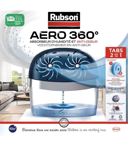 Assorbitore di umidità RUBSON AERO 360 40m² + 1 ricarica - 2622195 - Questa nuova tecnologia consente una circolazione dell'aria a 360° intorno e attraverso la ricarica per un controllo dell'umidità più efficace del 40%. Facile da usare, il deumidificatore AERO 360° è dotato di un sistema anti-tracimazione e di un sistema di ricarica ottimizzato, adattato esclusivamente alla scheda AERO 360°, per una maggiore efficienza. Grazie alla sua maggiore superficie a contatto con l'aria, la nuova linguetta combatte l'umidità e i cattivi odori in modo più efficace e rapido rispetto alle linguette tradizionali. Aiuta a purificare l'aria e a prevenire le allergie (raccomandato dall'AFPRAL, Association Française pour la Prévention des Allergies). - Prodotto spedito dalla nostra piattaforma di Rodez, Aveyron - prodotto conforme alle norme francesi. Il sistema RUBSON AERO 360° per l'assorbimento dell'umidità è composto da un dispositivo aerodinamico e da una ricarica Tab ultra-assorbente. - Prodotto ...
