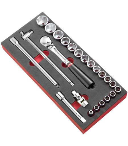 Strumento dotato di una soluzione di attacco FACOM SLS che garantisce la sicurezza contro qualsiasi rischio di caduta accidentale. La soluzione con gancio è adottata da FACOM per strumenti particolarmente pesanti e/o ingombranti. Solo l'attrezzo a cricchetto è dotato di un gancio. Il cricchetto e le prolunghe con blocco permettono di assicurare le bussole contro le cadute durante i lavori in altezza. Compatibile con il sistema di stoccaggio modulare FACOM: - Adatto alle cassettiere CHRONO XL, CHRONO+, JET XL e JET+. Comprende: - 1 x cricchetto 1/2" impermeabile ad alte prestazioni con blocco: SL.171SLS. - 18 x bussole 1/2" a 6 punte metriche: S.H 8 - 10 - 11 - 12 - 13 - 14 - 15 - 16 - 17 - 18 - 19 - 21 - 22 - 23 - 24 - 27 - 30 - 32 mm. - 2 prolunghe con blocco 1/2": L 130 mm (S.210RC) - L 250 mm (S.215RC). ...