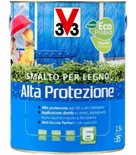 Smalto per Legno Alta Protezione 2,5 litri¯Smalto speciale all’acqua perfetto per proteggere e nutrire il legno esterno e interno. Alta Protezione di V33 è innovativo e unico perchè assicura massima protezione prendendosi cura del legno grazie alla sua formulazione che crea una pellicola mircroporosa e flessibile. Impermeabile e super resistente ai raggi UV, lo smalto legno Alta Protezione può essere applicato direttamente su vernici e impregnanti, su legno nuovo e vecchio.¯Smalto per Legno Alta ProtezioneQuesto prodotto è, altresì, formulato rispettando gli impegni d’azienda eco-responsabile. Infatti lo smalto per legno Alta Protezione appartiene alla famiglia di prodotti ECO-PROTECT e risponde alle seguenti 3 caratteristiche:¯SENZA SOLVENTI AGGIUNTI: Rilascio meno di 2g/l di COV. (Valore massimo UE autorizzato: 130g/l).¯SENZA METALLI PESANTI: Assenza di piombo, cromo, mercurio, cadmio, arsenico, bario.¯RISPETTO DELLA QUALITA’ DELL’ARIA: Emissione limitata di solventi e inquinanti ...
