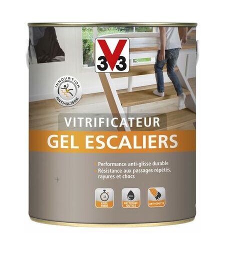 Fondo opaco incolore appositamente formulato per scale, rampe e balaustre, molto resistente al calpestio frequente e agli urti. Con una formula antiscivolo, limita il rischio di caduta sulle scale. La sua texture in gel antigoccia lo rende molto facile da applicare. Nome prodotto: Vetrificatore Destinazione: Tutte le stanze (eccetto cucina e bagno) < li >Utilizzabile su: Tutti i tipi di legno Colore: Trasparente Aspetto: Opaco Tipo di protezione: Lascia una pellicola protettiva Marchio del prodotto: V33 Capacità (in l): 2,5 Resa (in m²/l): 10 Resa per vaso (in m²): 25 Strumenti per l'applicazione: Pennello Tempo di asciugatura al tatto (in h): 1 Tempo di asciugatura tra 2 mani (in h): 3 Tempo di asciugatura completo (in h): 24 Strumenti per la pulizia: Acqua Manutenzione del lavaggio: Lavabile Avvertenze legali: Pericoloso. Rispettare le precauzioni d'uso Qualità dell'aria interna: A+ Numero di grammi di COV/l: 15 Prodotto confezionato: altezza (in cm): 18,3 Prodotto confezionato: ...