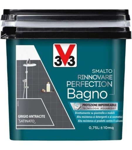V33 - SMALTO RINNOVARE PERFECTION BAGNO 750ML GRIGIO ANTRACITE SATINATO Applicazione diretta, senza utilizzo di un fondo Impermeabile Estrema aderenza e tenuta perfetta sui supporti (porcellana, piastrella, legno grezzo e verniciato, melaminico, listello) Alto potere coprente: copertura minima garantita al 98 percent, per un risultato uniforme e senza tracce Resiste ai lavaggi frequenti ...