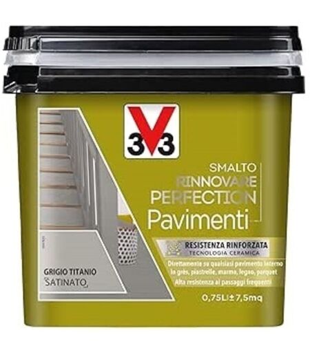 SENZA SVERNICIARE, DIRETTAMENTE SUL SUPPORTO!¯Rinnovare Perfection Pavimenti è lo smalto all’acqua ideale per rinnovare qualsiasi tipo di pavimento, senza fatica e alla portata di tutti.¯Infatti, grazie alla tecnologia Ceramica – Protezione Rinforzata, Rinnovare Perfection Pavimenti garantisce:¯Estrema resistenza ai passaggi frequenti¯Alta resistenza ai graffi e agli urti¯Super resistenza alle macchie e all’acqua¯Pratico e super comodo da usare, lo smalto Rinnovare Perfection Pavimenti di V33 si applica direttamente sul supporto, senza l’uso di un fondo. Inoltre è facile da mantenere, perchè è lavabile con qualsiasi detergente per la pulizia quotidiana. ...