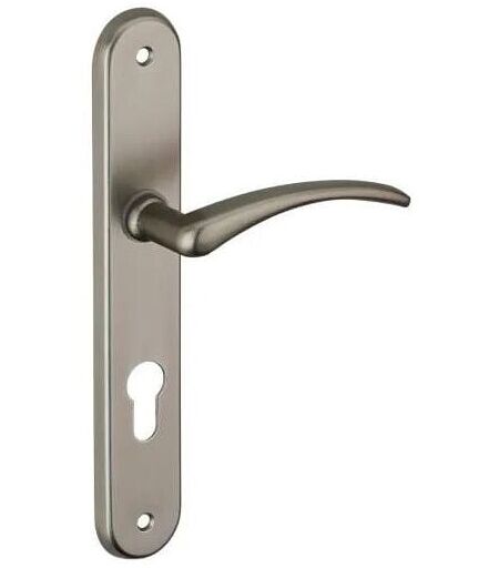 Maniglia per porte Selen, alluminio nichel satinato, E195, con foro cilindro. DescrizionePiastre in alluminio pressato. Maniglie a leva in alluminio fuso. Quadro in acciaio da 7 mm. Molla di ritorno. Viti metalliche frangibili. Distanza di fissaggio 195 mm.FinituraNichel satinato ...