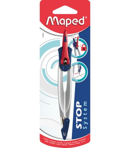 Bussola STOP SYSTEM in metallo con punta in grafite. Sistema brevettato di bloccaggio del braccio in una posizione specifica. Speciale cappuccio dell'ago che protegge dai tagli. Confezione blister da 1. ...
