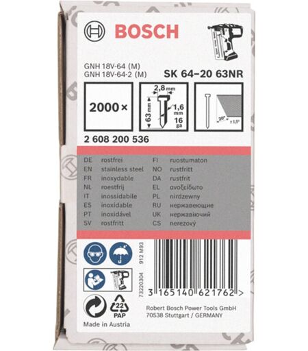 Caratteristiche del prodotto: Per la chiodatrice pneumatica GSK 18 V-Li Professional di Bosch. I chiodi a testa svasata 1,6/16 g 20° sono realizzati in acciaio inox resistente agli agenti atmosferici. Sono adatti per applicazioni come la costruzione di casse, i lavori con la tappezzeria, i telai di porte e finestre, le cornici, la costruzione di mobili, i rivestimenti per pareti e il cartongesso. I perni garantiscono una presa salda con una testa appena visibile. Consentono un'installazione facile e veloce di rivestimenti e di pannelli decorativi e battiscopa. I perni a testa svasata 1,6/16 g 20° sono prodotti in Europa e quindi hanno una qualità elevata e costante. Dati tecnici: Tipo: SK64-20 NR Calibro del filo mm: 1,6 Larghezza (B) mm: 2,8 Spessore (D) mm: 1,35 Lunghezza (L) mm: 63 Adatto per: GSK 18 V-LI (0601480301), GNH 18V-64 (0601481100), GNH 18V-64 M (0601481000) Contenuto della fornitura: 1x Bosch perno a testa svasata SK64 20NR 63 mm in ...
