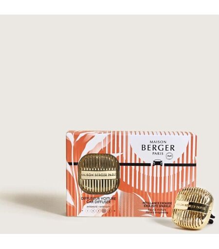 Maison Berger - Diffusore per Auto CANNELO + ricarica Pétillance Exquise Il diffusore per auto Cannelo Pétillance Exquise, disegnato dalla designer Sylvie de France, è un pezzo eccezionale. Il colore oro del diffusore, abbinato al motivo scanalato, richiama il rilievo delle montature delle iconiche lampade Berger. Questa collezione porta con sé una raffinatezza ed eleganza, che delizia gli amanti dell'estetica. Il profumo Pétillance Exquise, che accompagna questo diffusore, è un invito alla fuga. Le note di testa del pompelmo rivelano un'energia frizzante, che si fonde meravigliosamente con le note di cuore di patchouli, rosa e mughetto. Infine, le note di fondo di viola, muschio e accordi frizzanti apportano un tocco finale di morbidezza e raffinatezza. Il profumo Pétillance Exquise Tutto inizia con il bagliore tonificante della scorza di pompelmo; poi arriva l'eleganza e la delicatezza di un mazzo di fiori; infine, le note di un fondo esilarante e fruttato si insinuano con gioia... ...