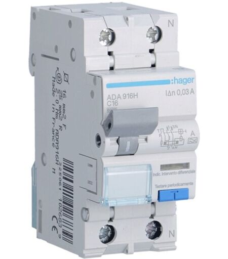 Hager Magnetotermico Differenziale 1P+N 16A 6kA 30mA curva c Tipo a 2M ADA916H