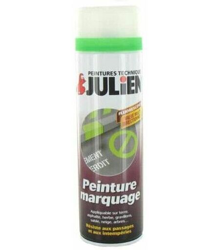 Presentazione: Aerosol marcatura Julien vernice è stato sviluppato appositamente per la marcatura, tracciabilità e l'identificazione. ? Principalmente utilizzato in opere pubbliche, edilizia, industria e tagging forestale, vernice spray questa marcatura s Julien si applica a tutti i media: terreno, erba, ghiaia, sabbia, neve, alberi? Julien vernice marcatura si asciuga rapidamente anche sui fondi bagnati e resiste passaggi e agenti atmosferici. Preparazione: nascondere le parti eventualmente da proteggere. Agitare la bomboletta per 2 minuti prima? Applicare (è necessario avere sentito il suono della miscela di perline). Applicazione: Applicare la testa in alto o in orizzontale per alberi, pilastri, pareti, soffitti ... Applicare a testa in giù per le strade, pavimenti asfaltate, parcheggi, campi sportivi ... Spray 10-15 cm dalla zona? a segnare. Agitare l'aerosol regolarmente durante l'applicazione di una buona homogéinité Lasciare asciugare per 10 minuti, anche con fondi umidi ...