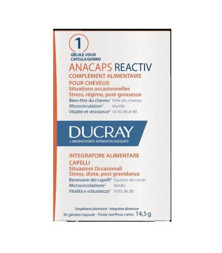 DUCRAY - ANACAPS REACTIV - Descrizione Integratore alimentare a base di aminoacidi, sostanze vegetali, vitamine e minerali. Contiene equiseto dei campi che favorisce il benessere dei capelli, mirtillo che participa all'attivazione della microcircolazione, vitamina B6 che contribuisce alla normale s… ...