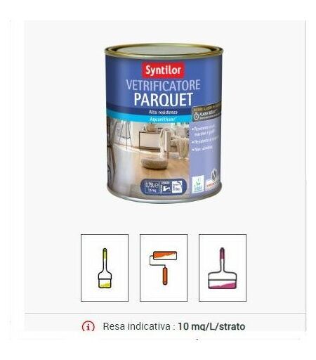 Rinnovare e proteggere il parquet non è mai stato così facile e veloce come con Syntilor. Grazie alla tecnologia Flash Resist, il VETRIFICATORE PARQUET essicca rapidamente, consentendo il riutilizzo dei locali in un giorno. Garantisce inoltre una resistenza molto elevata al calpestio. Punti di forza Resistente a urti, macchie e graffi Resistente al calpestio Non scivoloso : testato secondo la norma NF EN 13036-4** Eccezionale resistenza all'abrasione. Durata prolungata. Non scivoloso: consigliato per le scale. Idoneo per pavimenti riscaldati. Elevata resistenza ai “segni neri”. Essiccazione rapida: lavoro pronto in una giornata. Resistenza ai prodotti detergenti e all'acqua. Utilizzo Proteggere dalle macchie, Verniciare e proteggere il legno Destinazione Interni Locale di destinazione Pavimenti, parquet, Superfici orizzontali, Tutte le stanze Superficie di applicazione Parquet legno, Tutti i tipi di parquet, Vecchia finitura (vedi modalità d'uso) Numero mani consigliate 2-3 strati ...