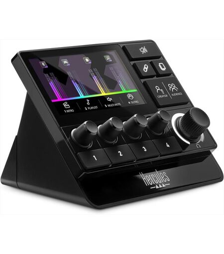 HERCULES Stream 200 XLR Audio controller - Controller Audio Professionale con Preamplificazione del Microfono, Schermo LCD, Codificatori ad Alta Risoluzione, 4 Pulsanti Azione e Interfaccia Personalizzabile. Controllo in tempo reale di tutti i livelli dei volumi in streaming: 4 codificatori per la gestione dei livelli dei volumi (con supporto della funzione mute), 2 pagine da 4 brani ciascuna + pulsante per la gestione delle pagine, codificatore volume cuffie, pulsante Mute All, controllo dell'audio proveniente da altre periferiche (console, secondo computer…), uscita cuffie, ingresso microfono XLR, connettore ottico, porta linea in ingresso, porta linea in uscita Gestione in tempo reale dei mix per pubblico e creatore: 2 x 2 VU-meter stereo per ogni traccia, pulsante per il cambio di mix Creatore/Pubblico, pulsante link per il controllo del volume, regolazioni in tempo reale senza dover Mixer con audio integrato, funzioni audio avanzate: Mute List, Solo, Push to Mute, preamplificazione per suoni vocali ad alta fedeltà? Controlli per la gestione dello streaming: 4 pulsanti azione assegnabili: mute multiplo, apertura di un URL, cambiamento dello scenario, ecc. Possibilità di personalizzazione avanzata dell'interfaccia: scelta di colore e stile dei VU-meter, icone e sfondi personalizzati, gestione del profilo Software integrato: app Hercules Stream Control. Le app principali per lo streaming sono pre-integrate nel software, in modo tale da poter facilmente gestire le scene del tuo stream (OBS, Streamlabs), assistenza integrata (installazione guidata, prodotto plug-and-play, interfaccia drag-and-drop). ...
