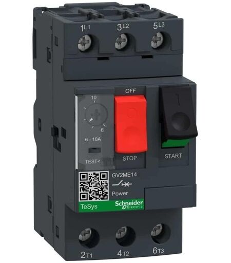 GV2ME14 è un interruttore automatico TeSys GV di Schneider Electric per motori. Assicura la protezione magnetotermica dei motori 3-4 kW a 400 V e un elevato potere di interruzione Icu 100 kA. GV2ME14 è un interruttore automatico TeSys GV di Schneider Electric per motori. Assicura la protezione magnetotermica dei motori 3-4 kW a 400 V e un elevato potere di interruzione Icu 100 kA. Controllo start-stop tramite pulsante garantito per 100.000 cicli AC-3 415V. GV2ME14 è un interruttore automaticoTeSys GV di Schneider Electric progettato per applicazioni motorizzate 3-4 kW a 400V. Soddisfa la protezione magnetotermica con un campo di regolazione termica 6-10 A, sgancio magnetico a 12 xIn e un elevato potere di interruzione Icu 100 kA a 400 V. Controllo start-stop tramite pulsante garantito per 100.000 cicli AC-3 415V. Disponibile in tutto il mondo, dispone di certificazione in base a diversi standard (IEC, UL, CSA, CCC, EAC, per uso in ambienti marittimi) ed è conforme a Green Premium ...