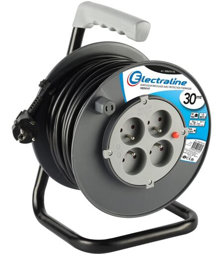 Avvolgicavo di 30 m con cavo HO5 VV-F 3G1, 5 mm² è dotato di 4 prese, disgiuntore termico di protezione. Ha una maniglia ergonomica e clip fermacavo per un trasposto facile. ...