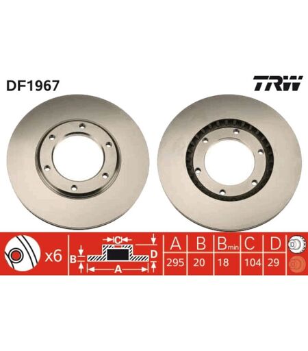 Altezza [mm]: 29.0. Asse di sviluppo: Davanti. Diametro del foro [mm]: 137.0. Diametro del foro centrale [mm]: 104.0. Diametro esterno [mm]: 295.0. Indice: DF1967. Lato di montaggio: Sinistra/Destra. Numero del Produttore: DF1967. Numero di fori di fissaggio: 6.0. Produttore: TRW. Scheibe mit Lager: Non. Spessore [mm]: 20.0. Spessore minimo [mm]: 18.0. Superficie: Lackiert. Tipo di disco: Ventilato. ...