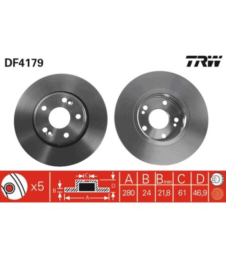 Altezza [mm]: 46,9. Asse di sviluppo: Davanti. Diametro del foro [mm]: 108.0. Diametro del foro centrale [mm]: 61.0. Diametro esterno [mm]: 280.0. Indice: DF4179. Lato di montaggio: Sinistra/Destra. Numero del Produttore: LUC DF4179. Numero di fori di fissaggio: 5.0. Produttore: TRW. Scheibe mit Lager: Non. Spessore [mm]: 24.0. Spessore minimo [mm]: 21.8. Superficie: Lackiert. Tipo di disco: Ventilato. ...