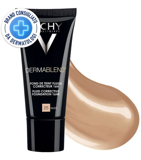 Vichy Dermablend Fondotinta Correttore Fluido 16h tonalità 25 - 30 ml correttore fino a 16 oreVichy Dermablend Fondotinta Correttore Fluido 16h tonalità 25 dalla texture liquida e leggera perfeziona l'incarnato nascondendo imperfezioni, occhiaie, rossori e macchie della pelle senza lasciare tracce o creare un effetto maschera. Fin dalla prima applicazione, il colorito appare uniforme e omogeneo, mentre il viso ritrova luminosità e radiosità. Specificamente formulato per correggere discromie, occhiaie e rossori diffusi, questo fondotinta offre una copertura impeccabile senza appesantire la pelle. La tonalità n. 15 Opal si fonde perfettamente con l'incarnato; garantendo un risultato naturale e a lunga tenuta. I pigmenti ad alta affinità cutanea, sapientemente calibrati nella formula del Fondotinta Correttore Dermablend, assicurano una tenuta fino a 16 ore* *(test di auto-valutazione su 75 soggetti), per un make-up impeccabile che dura tutto il giorno.• Efficace contro colorito non uniforme, occhiaie, rossori diffusi.• Regala una copertura perfetta delle imperfezioni cutanee, senza accumuli localizzati o effetto maschera. Tonalità n.25 Opal.• I pigmenti sono in affinità perfetta, come fusi con la pelle e concorrono nella formulazione del Fondotinta Correttore Dermablend ad offrire una tenuta per 16H* • Texture liquida e leggera• Agisce senza lasciare tracce *(Test di auto-valutazione su 75 soggetti).Modo d´uso:Detergere la pelle e applicare la crema da giorno abituale prima di stendere il fondotinta. Depositare un poco di fondotinta sul dorso della mano e scaldare la texture con piccoli movimenti circolari con la punta delle dita. Applicare picchiettando lievemente dall’interno verso l’esterno, per una ripartizione uniforme e rapida del prodotto sull’insieme del viso. Picchiettate sulle imperfezioni per una copertura ottimale. Stenderlo dall’interno verso l’esterno, accarezzando velocemente il viso.IngredientiAqua / Water / Eau, Undecane, Dimethicone, Glycerin, Titanium Dioxide [Nano] / Titanium Dioxide, Tridecane, Polyglyceryl,4 Isostearate, Pentylene Glycol, Cetyl Peg/Ppg,10/1 Dimethicone, Hexyl Laurate, Magnesium Sulfate, Disteardimonium Hectorite, Stearic Acid, Trihydroxystearin, Silica Silylate, Silica, Helianthus Annuus Seed Oil / Sunflower Seed Oil, Cellulose Gum, Aluminum Hydroxide, Disodium Stearoyl Glutamate, Tocopherol, Vitreoscilla Ferment, Acetylated Glycol Stearate, Pentaerythrityl Tetra,Di,T,Butyl Hydroxyhydrocinnamate, Ethylhexylglycerin ...