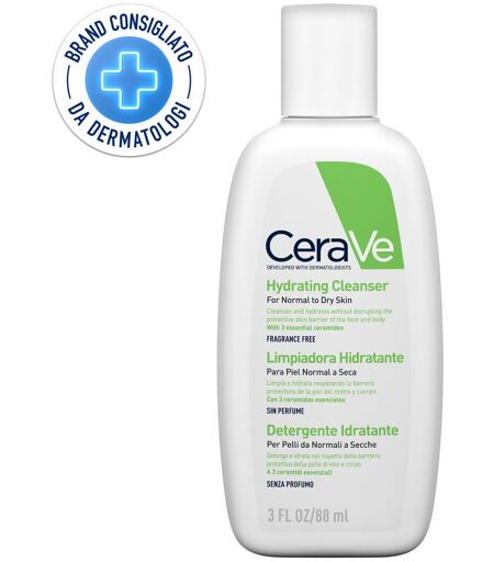 CeraVe Detergente Idratante Viso Pelle da Normale a Secca, con acido ialuronico e ceramidi 88 mlCeraVe Detergente Idratante rimuove impurità, make-up e altri residui ed è formulato per rispettare la naturale barriera protettiva della pelle, mantendendo il normale livello di idratazione. È un detergente viso e corpo delicato formulato con ingredienti quali le 3 ceramidi essenziali, che aiutano a rinforzare la barriera cutanea e a trattenere l'idratazione della pelle, e l’acido ialuronico, che aiuta a mantenere il livello di idratazione dello strato superficiale della pelle.CeraVe Detergente Idratante è stato sviluppato per detergere e rinfrescare la pelle delicatamente. Grazie alla presenza nella formula di 3 ceramidi essenziali, che aiutano a ripristinare la barriera cutanea, e all’azione idratante dell’acido ialuronico, questo detergente non comedogeno è una soluzione efficace per iniziare qualsiasi routine skincare su pelli da normali a secche. Questa formula utilizza la tecnologia di rilascio MVE (Multivesicular Emulsion) per donare continuo nutrimento alla pelle durante tutto il giorno e tutta la notte.Per pelli da normali a seccheGel non schiumogeno delicatoDeterge e idrata la pelle3 ceramidi essenziali: contribuiscono a ripristinare e mantenere la barriera naturale della pelleAcido ialuronico: aiuta a mantenere l'idratazione naturale della pelleProdotto non comedogeno, ipoallergenico, senza profumo. Dermatologicamente testato.Modo d´uso:Applicare sulla pelle bagnata con acqua tiepida, massaggiare la pelle con un delicato movimento circolare e risciacquareIngredientiAqua / Water, Glycerin, Cetearyl Alcohol, Phenoxyethanol Stearyl Alcohol, Cetyl Alcohol, Peg-40, Stearate, Behentrimonium, Methosulfate, Glyceryl, Stearate, Polysorbate 20, Ethylhexylglycerin, Potassium Phosphate, Disodium, Edta, Dipotassium Phosphate, Sodium, Lauroyl, Lactylate, Ceramide Np, Ceramide Ap, Phytosphingosine, Cholesterol Sodium, Hyaluronate, Xanthan, Gum Carbomer, Tocopherol, Ceramide Eop ...