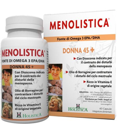 Menolistica - HOLISTICA - Indicazioni: squilibri ormonali della menopausa, disturbi della menopausa: vampate di calore, affaticamento, depressione, insonnia, aumento di peso. - Modalità d'uso: da 1 a 3 capsule al giorno durante i pasti. Sono consigliati periodi di 3 settimane di assunzione alternat… ...