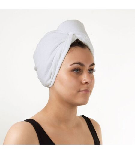 Asciugamano turbante in microfibra bianca. Questo turbante in maglia di microfibra spugna permette di asciugare i capelli rapidamente. Questo asciugamano turbante in microfibra si fissa grazie all'elastico e al bottone appositamente previsto. Lavabile a 30°. Materiale: 80% poliestere, 20% poliammide. Dimensioni: 50 x 23 cm. ...