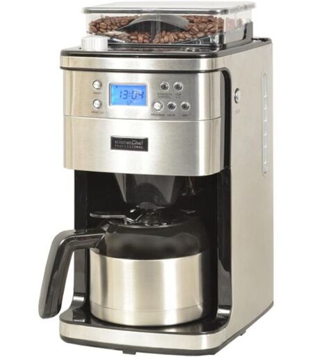 Macchina da caffè programmabile KitchenChef KCP4266 con macinacaffè e caraffa isotermica per mantenere caldo il caffè. Design semplice per questa caffettiera programmabile a doppia funzione KitchenChef KCP4266 ... utilizzabile con un macinacaffè o direttamente con caffè già macinato. La macinazione dei chicchi rivela il sapore e gli aromi di un caffè appena fatto. Regolazione della finezza della macinatura (8 livelli). Regolazione dell'intensità del caffè (3 livelli). Può essere utilizzato con il macinacaffè o direttamente con il caffè macinato. Materiale caraffa: acciaio inossidabile. Corpo rivestito in acciaio inox spazzolato. Filtro permanente rimovibile. Visualizzazione dell'ora sullo schermo digitale. Timer 24 ore con possibilità di partenza ritardata. Capacità tramoggia chicchi: 250 g. Potenza: 1000 Watt. Programmabile: sì. Capacità: 1.2 L. Capacità caffettiera: 10-12 tazze. Tipo di caffè: chicco, macinato. Selettore di aromi: sì. Arresto automatico: sì. Sistema antigoccia: sì. ...