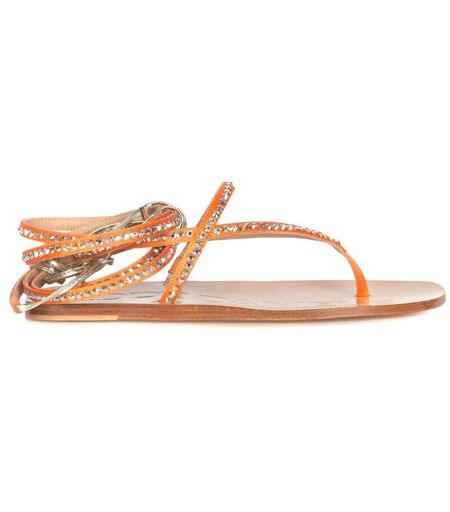 Sandalo infradito con swarovski. Punta tonda. Tacco basso. Cinturini in pelle rivestiti in raso con swarovski applicati. Chiusura modello schiava. Soletta in cuoio con logo inciso in tinta. Suola in cuoio con piccolo inserto in gomma sul tallone. Altezza tacco: 1 cm. Calzata: regolare. Made in Italy. Busta per proteggere e trasportare le scarpe. ...