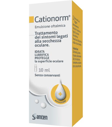 Cationorm - Descrizione Emulsione oftalmica sterile ipotonica senza conservanti che si presenta sotto forma di liquido di aspetto lattescente. Cationorm è indicato per il trattamento dei sintomi di secchezza oculare come dolore, prurito, bruciore oculare o sensazione di corpo estraneo (granello di … ...