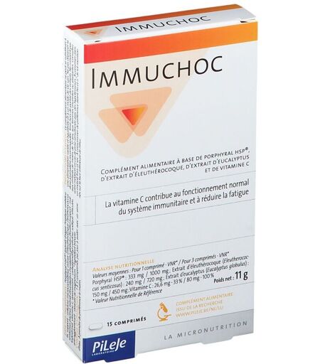 Complément alimentaire à utiliser dans le cadre d'une alimentation variée, équilibrée et d'un mode de vie sain.Immuchoc est un complément alimentaire à base de Porphyral Hsp®; d’extrait d’éleuthérocoque; d’extrait d’eucalyptus; et de vitamine C.La vitamine C contribue au fonctionnement normal du système immunitaire et à réduire la fatigue.Composition :Porphyral Hsp®* (extrait d’algue Porphyra umbilicalis, support : cellulose microcristalline), extrait d’éleuthérocoque Eleutherococcus senticosus (racine), extrait d’eucalyptus Eucalyptus globulus (feuille) (support : maltodextrine), vitamine C, épaississant : carboxyméthylcellulose sodique réticulée, anti-agglomérant : stéarate de magnésium.* ingrédient breveté.Valeur nutritionnelle : Pour 1 compriméAJR*Pour 3 comprimésAJR*Porphyral Hsp®333 mg-1 000 mg-Extrait d'éleuthérocoque240 mg-720 mg-Extrait d'eucalyptus (Eucalyptus globulus)150 mg-450 mg-Vitamine C26,6 mg33 %80 mg100 %Conseils d'utilisation :1 à 3 comprimés par jour à avaler avec un verre d'eau. À prendre de préférence le matin.Précautions d'emploi :Ne pas dépasser la dose journalière recommandée. Tenir hors de portée des enfants.Poids net :11 g = 15 comprimésFabricant :PiLeJe 7, rue des Deux Provinces Saint-Laurent-Des-Autels 49 270 Orée d'AnjouFrance ...