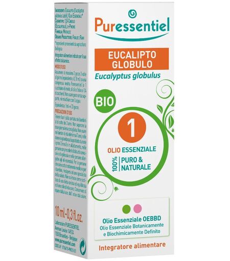 PURESSENTIEL EUCALIPTO GLOBULO BIO - Descrizione Integratore alimentare indicato per il suo effetto balsamico. - Ingredienti Eucalipto (Eucalyptus globulus Labill.) olio essenziale*. Chemotipo: 1,8 - cineolo (eucaliptolo), alfa - pinene. *Ingredienti provenienti da agricoltura biologica. - Modalità… ...