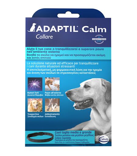 ADAPTIL Calm Collare L - Descrizione Collare per cani di taglia media e larga, che fornisce un comfort costante al cane, aiutandolo a calmarsi ed adattarsi alle situazioni stressanti nell'ambiente esterno. Utilizzarlo in caso di rumori forti (fuochi d'artificio, temporali), quando ha paure nell'amb… ...