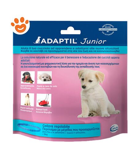 Il Collare Adaptil Junior aiuta il tuo cucciolo ad apprendere e ad adattarsi alle nuove situazioni. L'adozione è un momento impegnativo per i cuccioli perchè devono affrontare varie difficoltà come la separazione dalla madre, una nuova casa, rimanere da solo e altro. Adaptil Junior rilascia "messaggi rassicuranti" (scientificamente noti come feromoni appaganti del cane) come quelli rilasciati dalla madre per calmare e rassicurare i suoi nuovi cuccioli. Adaptil Junior è indicato dal momento dell'adozione fino al 6° mese di età per rassicurare il cucciolo nelle seguenti situazioni: pianti e lamenti notturni paura dei rumori forti restare a casa da solo socializzazione/educazione. Composizione: Analogo del feromone appagante del cane 5%, eccipienti q.b. a 1 collare 100 g. ...