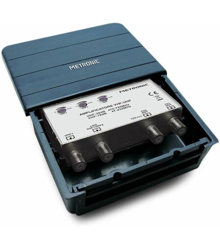 2 ingressi (UHF+VHF, UHF) e 2 uscite TV Gamma operativa UHF 470-694MHz Gamma operativa VHF 47-230MHz Guadagno VHF regolabile da 5 a 20dB Guadagno UHF regolabile da 13 a 28dB Tensione in ingresso: 100-240V ~ 50/60Hz 1 uscita con alimentazione 12V Amplificatore TV da esterno 5G 2 ingressi/2 uscite L'amplificatore e miscelatore Metronic 432169 serve a migliorare la ricezione del segnale e, di conseguenza, la qualità dell'immagine sulla vostra TV. Permette di miscelare segnali VHF e UHF provenienti da antenne differenti anche combinate VHF+UHF (es. logaritmiche). Regolazione di guadagno su bande separate per regolare i segnali VHF e quelli UHF. Consente un'ottimizzazione del livello di ricezione. Filtraggio 5G integrato, che consente di adattare l'impianto TV esistente al nuovo standard UHF (470-694MHz) e garantisce una protezione efficace contro le potenziali interferenze legate alla tecnologia LTE. ...