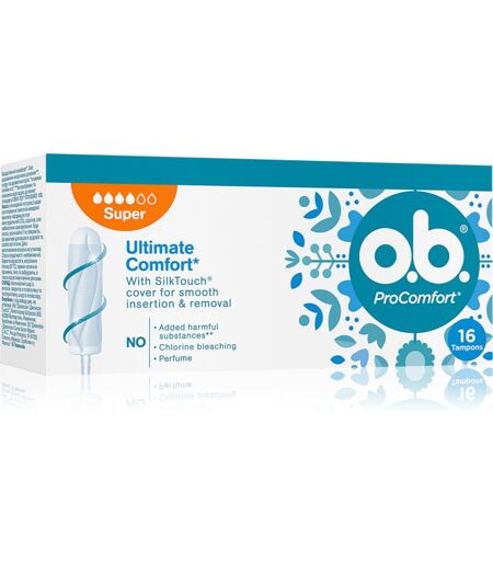 o.b. Pro Comfort Super, 16 pz, Spugne mestruali per donna, Caratteristiche: taglia ideale per le giornate con mestruazioni abbondanti si adatta ai movimenti del corpo meccanismo per aprire in modo semplice e veloce il tampone le scanalature multidirezionali aumentano la capacità del tampone Composizione: non sbiancati con il cloro Modo d’uso: Seguire le istruzioni riportate sul foglietto illustrativo. ...