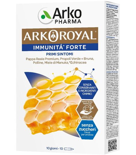 ARKOROYAL IMMUNITÀ FORTE SENZA ZUCCHERI DescrizioneIntegratore alimentare con pappa reale, propoli verde, propoli bruna, polline, miele diManuka e echinacea. Associa l’echinacea ad un complesso di 5 prodotti dell’alveare. Il pollineaiuta a rinforzare il sistema immunitario, mentre l’echinacea aiuta a sostenere ledifese del corpo ai primi sintomi dei disturbi invernali. Senza conservanti e ingredienti chimici. IngredientiEstratto di radice di echinacea [Echinacea purpurea (L.) Moench.], pappa reale, estrattodi foglia di stevia [Stevia rebaudiana (Bert.) Bertoni]; addensante: gomma di acacia;succo concentrato di arancia [Citrus sinensis (L.) Osbeck], estratto di propoli bruna,estratto di propoli verde, estratto di polline, miele di Manuka. Caratteristiche nutrizionali Valori medi per 1 flaconcino Estratto di radice di echinacea Pappa reale 1.000 mg Estratto di propoli bruna 150 mg Estratto di propoli verde 150 mg Estratto di polline 38 mg Miele di Manuka 38 mg Modalità d'usoDai 12 anni. Dai primi sintomi, prendere 1 unidose al mattino a colazione, diluita in unbicchiere d’acqua (200 ml), per 10 giorni. È possibile ripeterel’utilizzo più volte l’anno. La presenza di un leggero depositonell’unidose è normale e non altera la qualità del prodotto. Agitare prima dell’uso. Prendere l’unidose con la parte più strettarivolta verso l’alto. Con i due pollici premere verso il basso. Conservareun’unidose già svuotata per aiutarsi ad aprire le successive. AvvertenzeNon superare la dose giornaliera consigliata. Tenere fuori dalla portata dei bambini aldi sotto dei 3 anni di età. Gli integratori alimentari non vanno intesi comesostituti di una dieta variata ed equilibrata e di uno stile di vita sano. Nonconsigliato in gravidanza o in allattamento in assenza di dati sufficienti. Sconsigliatoalle persone con precedenti di allergie ai prodotti dell’alveare. ConservazioneConservare al riparo dalla luce, dal calore e dall’umidità. Validità a confezione integra: 36 mesi. Formato10 flaconcini monodose da 15 ml. Cod. 91070154 ...