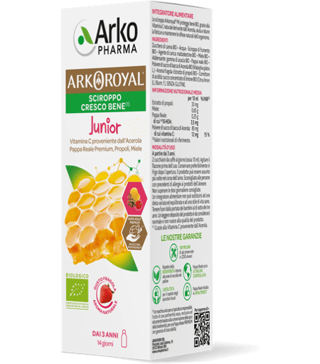Concentrato fluido kid Integratore alimentare a base di un concentrato fluido di miele, pappa reale, estratto di china e 8 vitamine per favorire l'appetito dei bambini ed aiutarli a crescere. Pappa Reale: Nutrimento esclusivo dell'ape regina costituisce per il bambino un'ottima fonte nutrizionale di vitamine naturali e di aminoacidi. La Pappa Reale stimola l'appetito ed è un ottimo ricostituente. La China: È un albero dell'America del sud. La scorza contiene il chinino, usato da sempre per favorire l'appetito.La Pappa Reale Arkopharma è totalmente esente da tracce di Cloramfenicolo).Non contiene glutine.Senza alccol, gusto pera/banana Non superare la dose giornaliera raccomandata. Tenere fuori dalla portata dei bambini al di sotto dei 3 anni di età. Gli integratori non vanno intesi come sostituti di una dieta variata. Fruttosio; acqua; maltodestrine; miele; pappa reale (1,9%, aromi: aroma pera, aroma banana, aseinato di sodio); conservante: sorbato di potassio; vitamina B3; acidificante: acido citrico; vitamina B5; vitamina A (gelatina, saccarosio, amido modificato); vitamina D3 (trigliceridi a catena media, saccarosio, amido modificato); vitamina B6; vitamina B12 ...