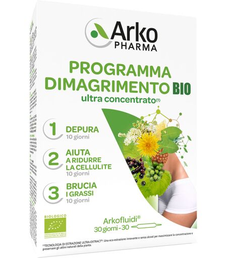 Arkopharma Arkofluidi Programma Dimagrimento Bio 30 Fiale Caratteristiche: Arkopharma Arkofluidi Programma Dimagrimento BIO è un integratore alimentare naturale e ultra concentrato, studiato in 3 fasi consecutive per accompagnare il percorso di dimagrimento in modo completo ed efficace. Step 1 – Depura (10 giorni): con Rafano nero, Tarassaco, Sambuco e Limone. Supporta la detossificazione epatica, stimola il metabolismo e prepara l’organismo alla perdita di peso. Step 2 – Riduce la Cellulite (10 giorni): con Matè, Uva, Ananas e Finocchio. Riduce la ritenzione idrica, stimola il drenaggio linfatico e migliora l’aspetto della pelle. Step 3 – Brucia Grassi (10 giorni): con Caffè verde, Guaranà, Tè verde e Olmaria. Favorisce la termogenesi e aumenta il dispendio energetico per ridurre la massa grassa. Un programma dimagrante naturale, certificato biologico, che unisce depurazione, drenaggio e attivazione metabolica per risultati visibili. Formato: 30 fiale (3 step da 10 giorni ciascuno) Integratore alimentare certificato BIO Depurazione epatica e metabolica Azione drenante e anticellulite Stimola il metabolismo e la termogenesi Senza coloranti, conservanti o edulcoranti artificiali FAQ Arkopharma Arkofluidi Programma Dimagrimento Bio 30 Fiale: A cosa serve Arkofluidi Programma Dimagrimento Bio? Serve a supportare il dimagrimento grazie a un percorso in 3 step: depurazione, drenaggio e brucia grassi, migliorando metabolismo e benessere generale. Come si assume Arkofluidi Programma Dimagrimento Bio? Il programma prevede 1 fiala al giorno, per 30 giorni, suddivisa in 3 cicli di 10 giorni ciascuno, seguendo le fasi Depura, Riduce la Cellulite e Brucia Grassi. È adatto a tutti? È un integratore naturale, indicato per adulti. Si consiglia di chiedere parere medico in caso di gravidanza, allattamento o patologie specifiche. Arkofluidi Programma Dimagrimento Bio aiuta contro la cellulite? Sì, la fase 2 con Matè, Uva, Ananas e Finocchio favorisce il drenaggio dei liquidi e contribuisce a ridurre la visibilità della cellulite. Quanto dura il trattamento con Arkofluidi Programma Dimagrimento Bio? Il programma dura 30 giorni, suddivisi in 3 step da 10 giorni ciascuno, per un’azione graduale e completa su metabolismo, ritenzione idrica e grasso corporeo. ...