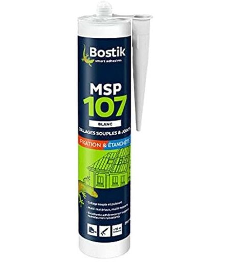 Presentazione: mastice Bostik MSP 107 bianco bonding polimero e la sigillatura, supporti umidi. BONDING: - flessibile elementi leganti possono subire piastrelle vibrazioni o chocs.Collage, battiscopa, elementi decorativi tubi divers.Collage e pluviali. RESISTENZA ACQUA: - I giunti di dilatazione, giunti di frazionamento su calcestruzzo, balconi, finestre di tenuta supporto sub, verande, serres.Calfeutrement muratura, partizioni, cornici in legno e metallo, barche, caravan, carrozzerie. Caratteristiche: Colore: trasparente Tempo pelle: 20 minuti Secco al tatto: 50 minuti Temperatura di applicazione: da + 5 a + 35 ° C Temperatura: - 40 a + 100 ° C la velocità di polimerizzazione: 3 mm ogni 24 ore Vantaggi: non contiene solventi o isocianati. Ottima resistenza agli agenti atmosferici e ai raggi UV. Non corrode i metalli. Eccellente adesione compresi supporti umidi (non saturi e gocciolanti). Riprende le sue proprietà iniziali dopo la compressione o allungamento. Compatibile con la ...