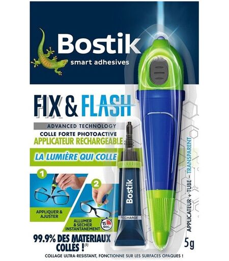 Adesivo Bostik Fix and Flash Bostik - 322735 Con Fix and Flash, Bostik porta l'ultima tecnologia professionale alla portata di tutti per i piccoli lavori di bricolage, decorazione e hobby. Basato sulla polimerizzazione UV, Fix and Flash colla foto-attiva ultra-forte assicura un legame perfetto, forte e potente in pochi secondi.Bostik Fix & Flash offre ora il piacere di incollare, creare e reincollare e riparare piccoli oggetti quotidiani: una colla che è sia regolabile come le colle multiuso, sia istantanea come le colle. Grazie alla sua tecnologia di asciugatura alla luce, Fix & Flash permette di incollare su richiesta: si applica la colla, si regola la colla, si accende la luce e si incolla! Fix&Flash; incolla tutti i materiali a tutte le superfici. Pratico da usare grazie al suo applicatore e al suo ugello fine, permette un incollaggio preciso e pulito.Più ecologico, Fix & Flash è privo di pittogrammi di pericolo e ricaricabile (tubo Fix & Flash da 5g)! Anche le batterie della ...