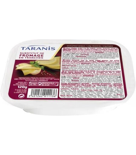 TARANIS Formaggette - Descrizione Alimento aproteico tipo formaggio a fette. Indicato per le diete che richiedono un ridotto apporto di proteine e un controllo sugli aminoacidi. Ingredienti Acqua, amido di manioca, burro concentrato, fecola di patate, addensanti (E461, E407, E410, E508), fibre vege… ...