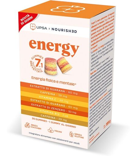 UPSA X NOURISHED ENERGY - Descrizione Integratore alimentare con edulcoranti per adulti. Gummies con guaranà, caffeina, zenzero e vitamine riducono stanchezza e affaticamento, tonificano mente e corpo, aumentano l'attenzione. - Ingredienti Edulcoranti: sciroppo di maltitolo ed eritritolo; aromi nat… ...