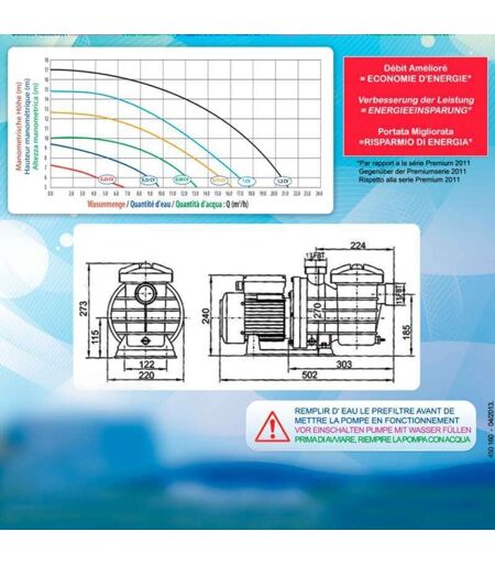 Informazioni tecniche : Pompa filtrante Mareva Portata massima 6,5 m³/h Pumpa filtrante auto-aspirante Equipaggiata con un coperchio trasparente Apertura facile per rotazione di un quarto di giro Potenza 0,25 cv Motore 250 watt Tensione di alimentazione: 230 volt Livello sonoro 61db Equipaggiata con un prefiltro 1,2 bar con cestello Asse in acciaio inox Dimensioni raccordi Aspirazione e riflusso: 50 e 38 mm ...