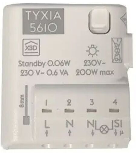 Ricevitore per illuminazione connessa 200 W max Tyxia5610. Controlla l'accensione/spegnimento dell'illuminazione da uno o più accessori del trasmettitore wireless. Associato ad un rilevatore di apertura senza fili, l'apparecchio senza fili controlla l'illuminazione di una stanza quando la porta viene aperta. Report allarmi e monitoraggio degli allarmi Tyxal+ attivati/disattivati ...