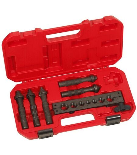 Virax - Battitore a collare per tubo Ø 6 - 8 - 10 - 12 - 14 mm Apparecchio per tubo di rame ricotto. I fori di questo stampo sono smussati a 90° su un lato per formare i collari conici con la fresatrice e ad angolo spezzato sull'altro lato, per ottenere i collari piatti con l'aiuto dei mandrini e dopo la preformazione con la fresatrice conica. 4 perni opposti facilitano l'installazione tra le ganasce di una morsa parallela. Strumenti fosfatati. Consegnato con un router e mandrini semplici e a gradini in una custodia di plastica. - Stampo per tubo O.D. : 6 - 8 - 10 - 12 - 14 mm, fresa a 90° per tubo O.D. : 6 a 14 mm, mandrino semplice da 10 e 12 mm, mandrino a gradini da 8 a 14 mm ...