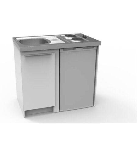Angolo cottura completo CADETTE Corpo, ante e frontali in pannello melaminico da 16 mm. Con filettatrice Ripiano interno Guancia laterale Porta con maniglia su bordo in alluminio spazzolato Cerniere a clip con ammortizzatore. Piedini del martinetto regolabili in altezza (da 0 a 15 mm) Vespasiano regolabile Lavello della cucina con piano cottura integrato: 1 serbatoio reversibile Acciaio inossidabile liscio 18/10 o F17 Scolapasta a forma di petalo per una lunghezza di 1200 mm o scolapasta diritto per una lunghezza di 1000 mm Scarico completo di tappo a catena Ø60 mm con attacco per lavastoviglie, troppopieno e sifone a vasca ridotta. 2 piastre elettriche da incasso con joystick, potenza totale 3000W (Ø145 mm 1500W x2) Prodotto plus : Manico in alluminio spazzolato sul bordo per una maggiore resistenza all'umidità. Elettrodomestici inclusi: Frigorifero 82L, 48 cm, 2 stelle ...