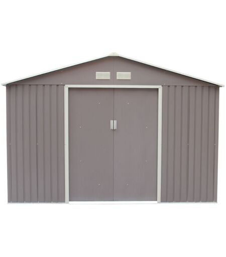 Caratteristiche: Materiale: pareti e tetto in metallo zincato (trattamento anticorrosione) Struttura: acciaio zincato a caldo (trattamento anticorrosione) Tetto a due versanti inclinati per un drenaggio ottimale della neve e della pioggia 4 griglie di ventilazione 2 porte scorrevoli 2 maniglie bloccabili tra loro (lucchetto non incluso) Colore delle pareti interne/esterne: grigio Colore della struttura: beige Dimensioni: Superficie: 10,85 m² Esterno: 340 x 319 x 210 cm Interno: 330 x 309 cm Porta aperta: 138 x 162 cm Altezza del muro: 165 cm Pannelli: 0,25 / 0,3 mm Peso: 105 kg ...