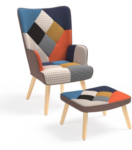 IDMARKET Poltrona scandinava ivar con poggiapiedi in tessuto patchwork multicolore e stampa pied-de-poule